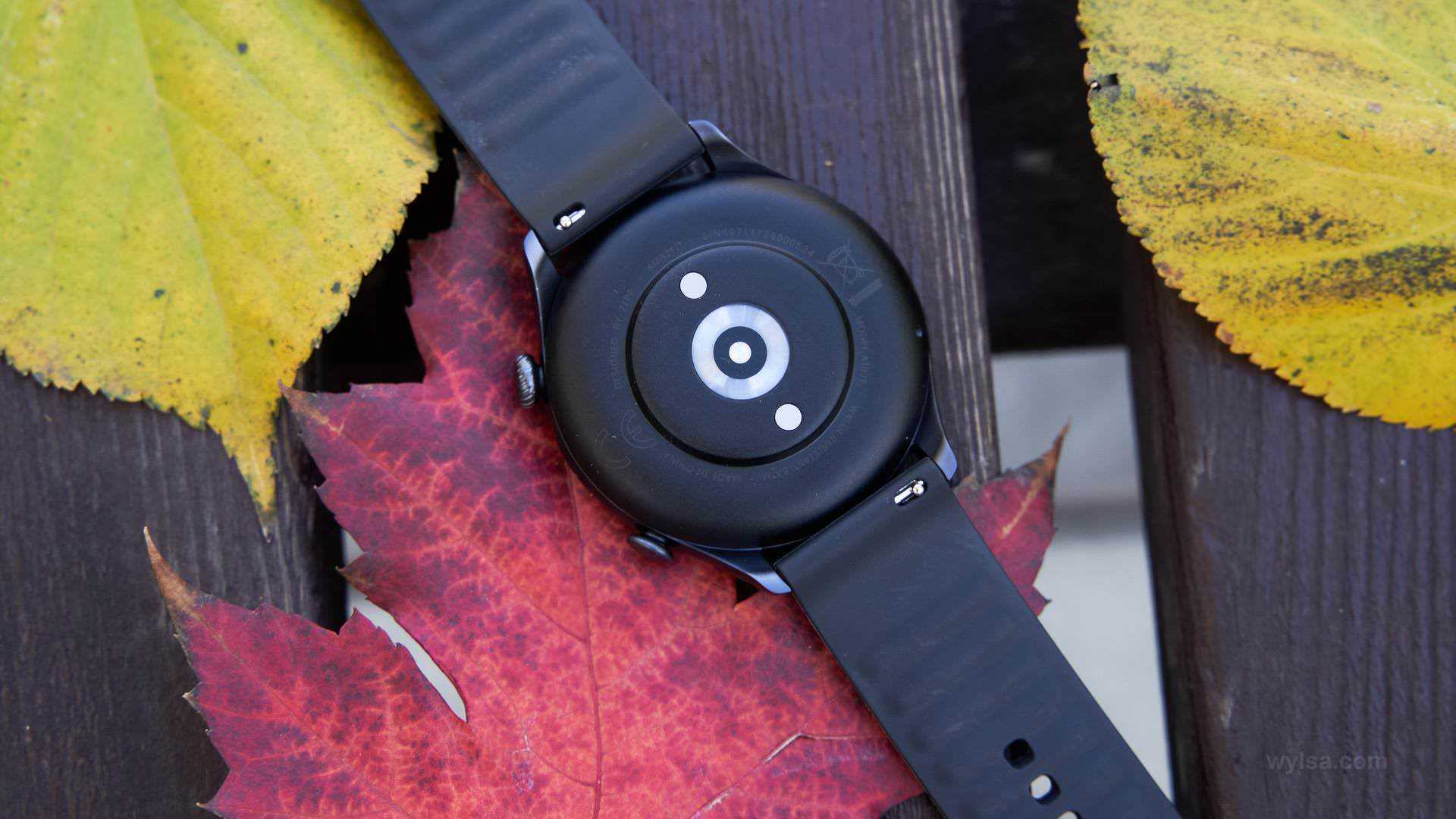 На задней панели мы видим круглый датчик для измерения сердечного ритма и четыре магнитные точки для зарядки умных часов.