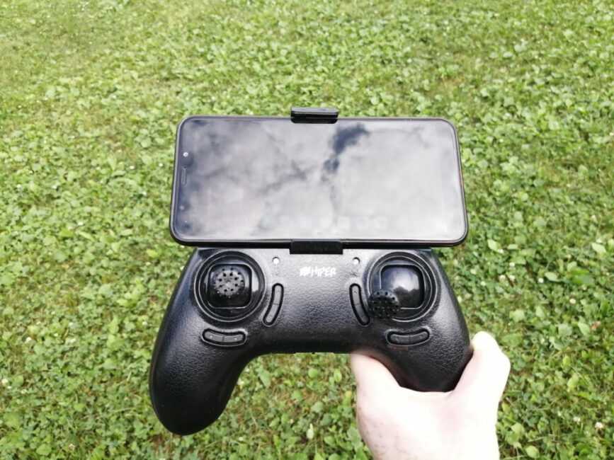 Контроллер удобен, но с большим смартфоном становится плохо сбалансированным. Было бы полезно иметь более ощутимые ручки, которые глубже ложатся в руки. Форма, подобная мыльнице, не является верхом комфорта, но беспилотник контролируется уверенно.