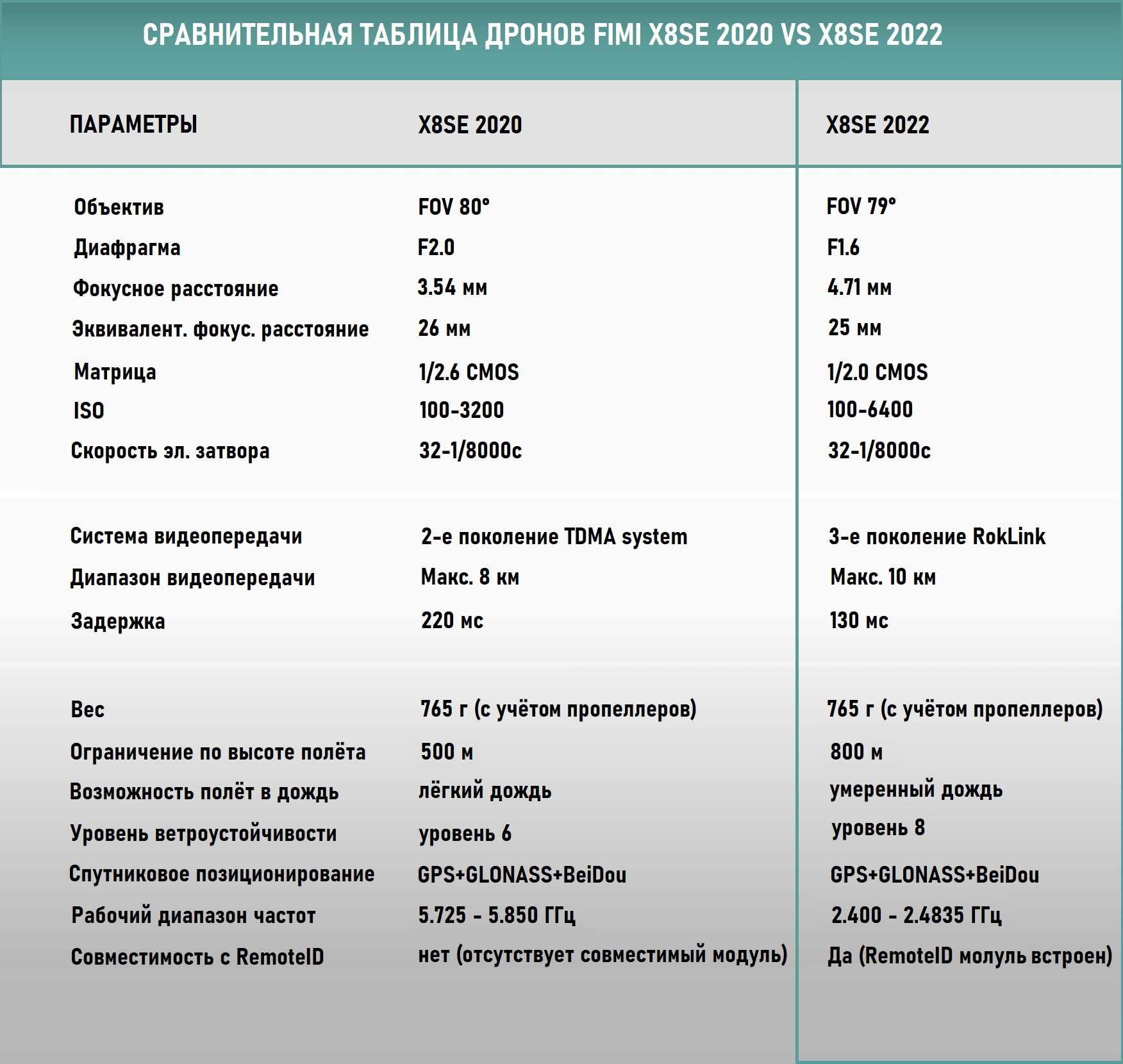 Сравнительная таблица ключевых параметров доработанной версии дрона FIMI X8SE 2022 с предшественником FIMI X8SE 2020: