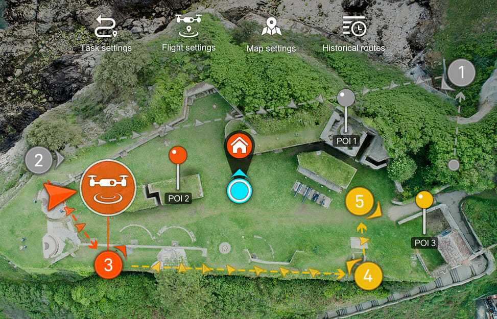 Режим «Flight planing shooting» с возможностью планирования задач позволяет пользователю планировать не только полёт, но и устанавливать точки интереса (POI) на которые камера беспилотника сделает акцент при выполнении автоматического полёта.