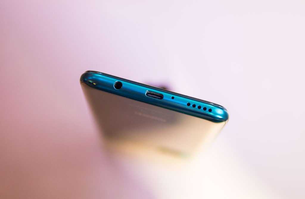 USB-C, NFC, Bluetooth 5.0, сканер отпечатков сбоку, разъём для наушников 3,5 мм, гибридный слот Dual SIM.