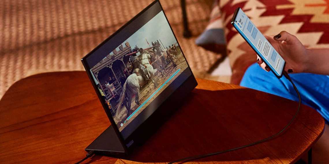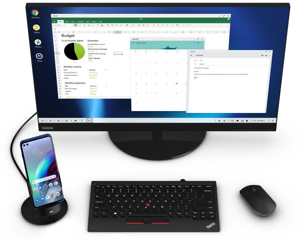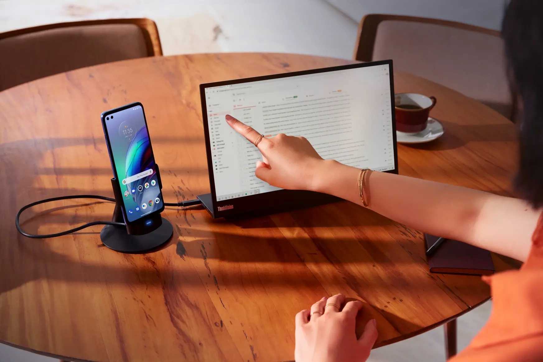 Кабель соединяется с Moto G100 через разъем USB-C, другой стороной — с монитором или телевизором через HDMI или тот же USB-C (на выбор). Если добавить к такому набору беспроводные мышку и клавиатуру, получится компьютер, который всегда с собой.