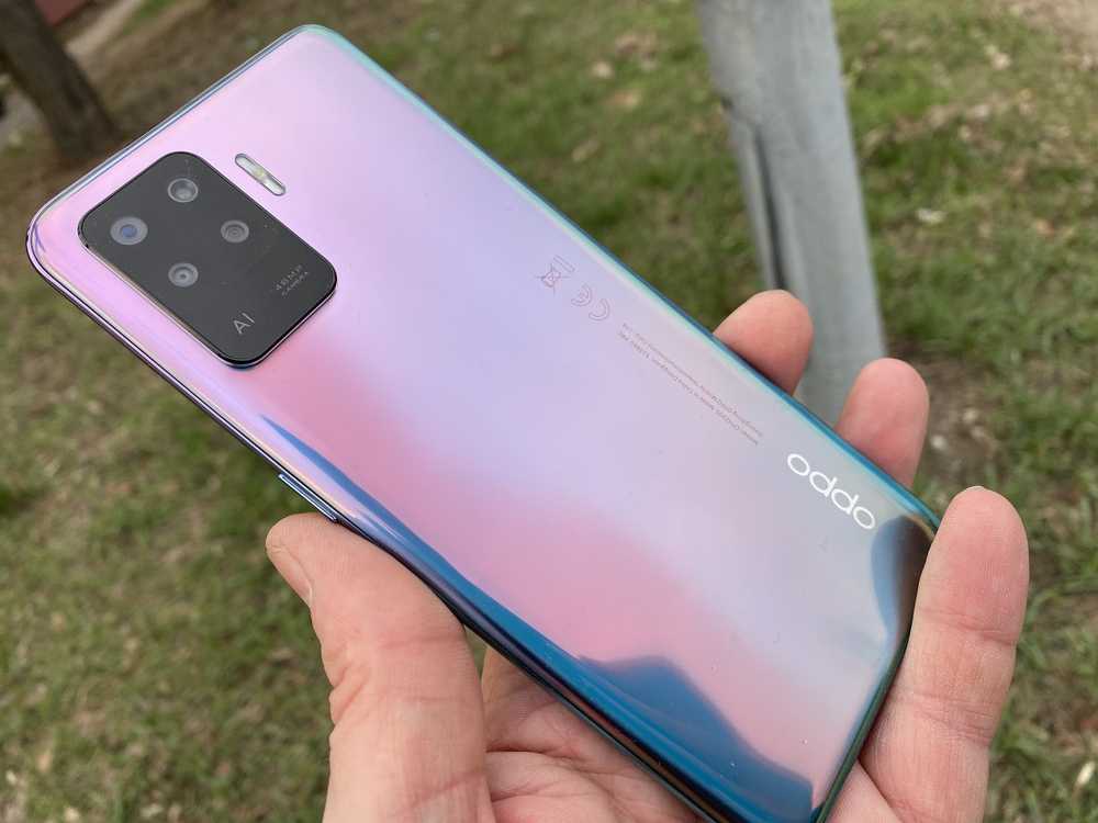 На задней панели вверху слева расположен прямоугольник с четырьмя камерами и красноречивой надписью AI, а с правой стороны есть продольная светодиодная полоса. Да, островок камеры несколько выступает над корпусом, но не очень, поэтому любой чехол, даже тот, что в комплекте, почти нивелирует это. Внизу логотип компании OPPO и все. Все остальное — невероятный цвет и его оттенки.