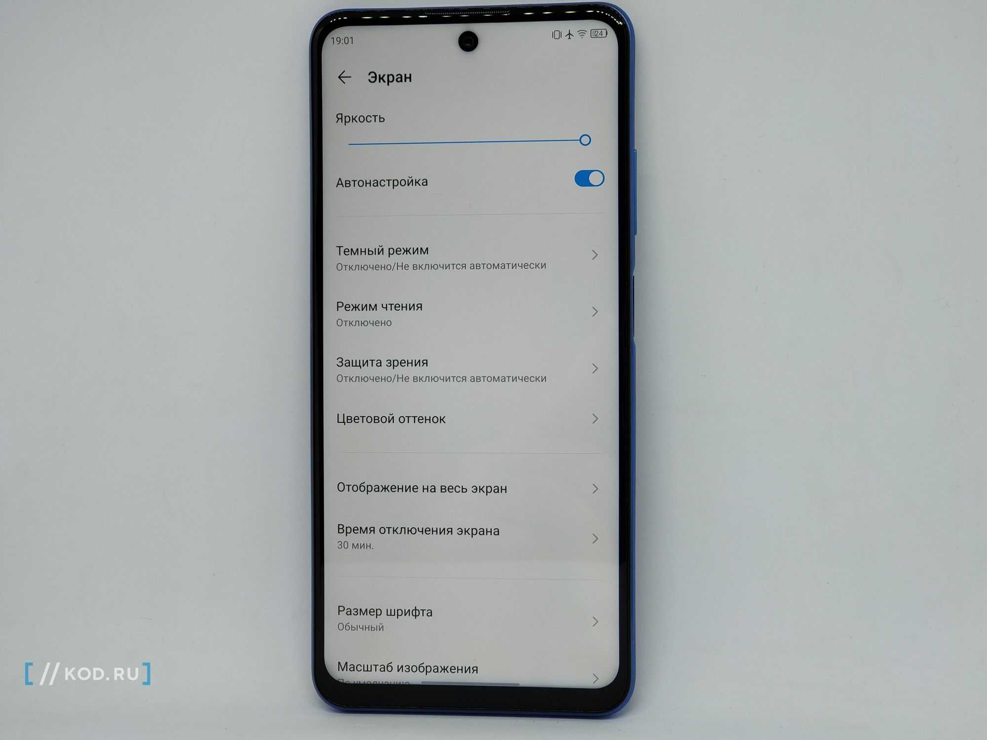 Настройки дисплея аскетичные, есть ряд режимов защиты зрения, можно настроить цветовую гамму и масштаб изображения. Повышенную частоту обновления не завезли, всё таки её отсутствие ощущается при переходе даже с 90 Гц. Если же полноценно пользоваться смартфоном, то этот диссонанс быстро уходит на второй план. Яркость не самая высокая, пользоваться под ярким освещением можно, но придется включить светлую тему для лучших результатов.