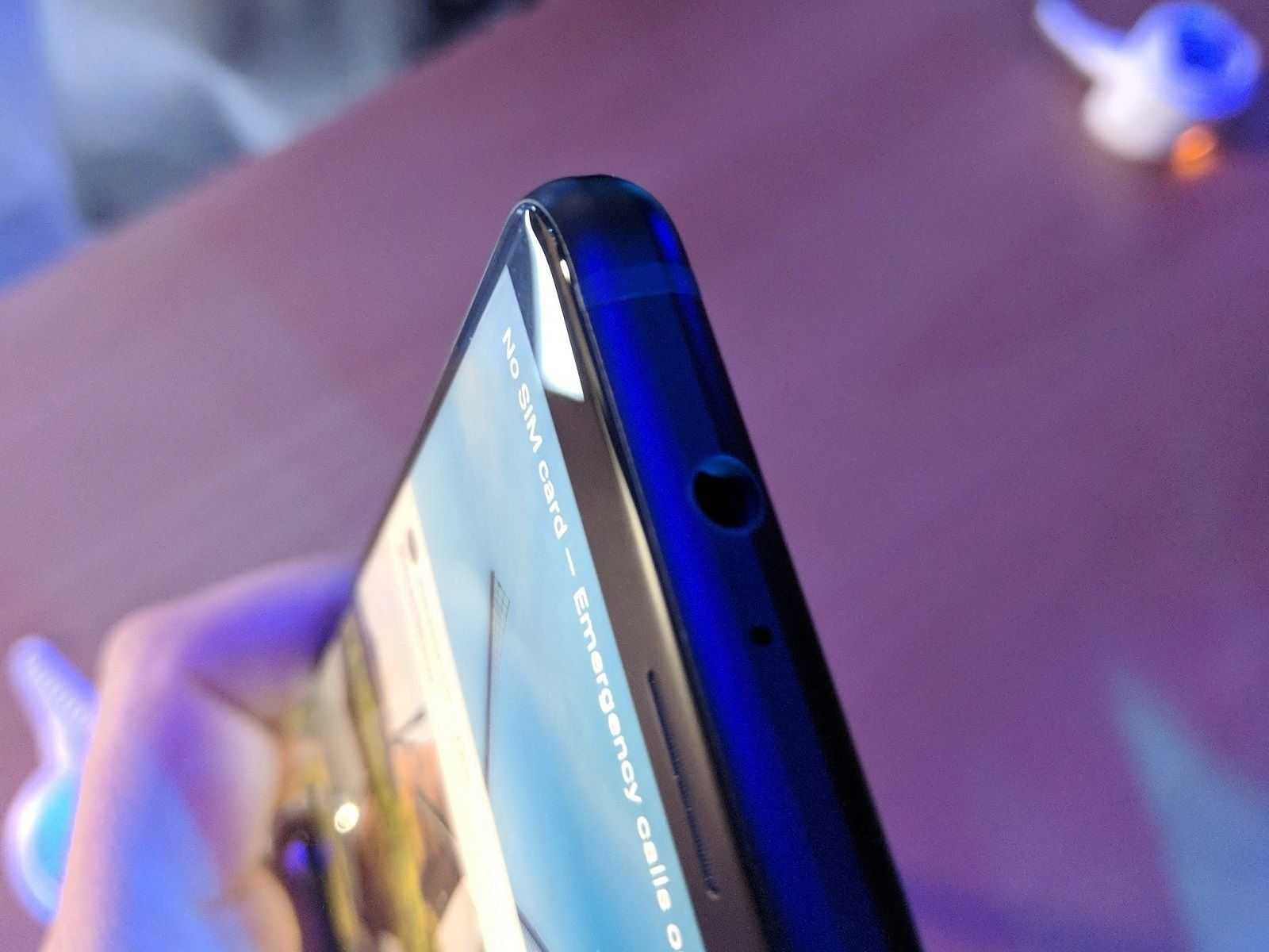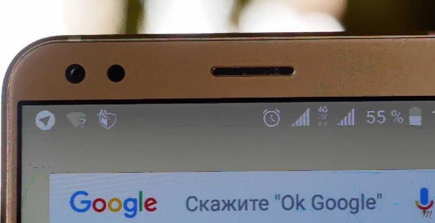 В верхней части по центру имеется каплевидная выемка под 13 Мпикс фронтальную камеру. Динамик для телефонных звонков разместился на верхней кромке аппарата. Запаса громкости хватает для общения в шумном помещении или в общественном транспорте. Справа от динамика есть точечный индикатор. Он светится красным при разрядке или неотвеченных вызовах и сообщениях.