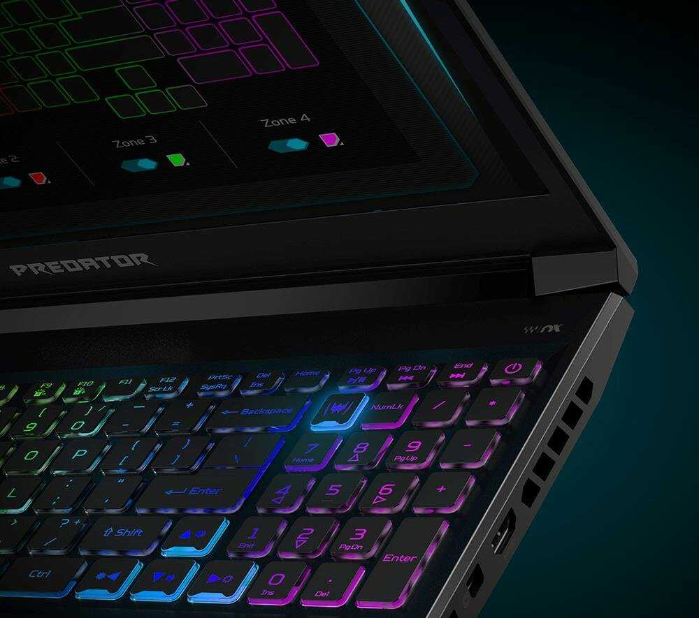 Клавиатура имеет 4-уровневую (в плане яркости) RGB-подсветку. Причем в программе PredatorSense вы можете настроить четыре различные зоны свечения или использовать один из пяти динамических профилей, таких как «Дыхание», «Волна», «Масштаб», «Сдвиг» и «Неон».