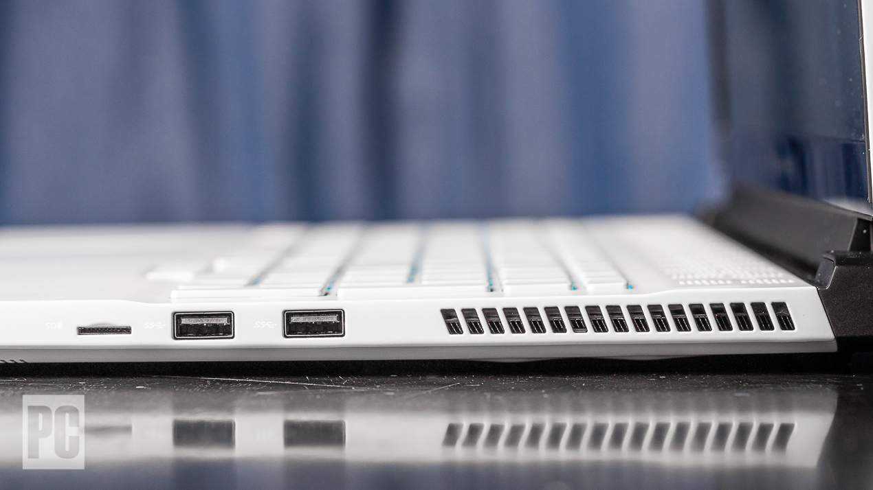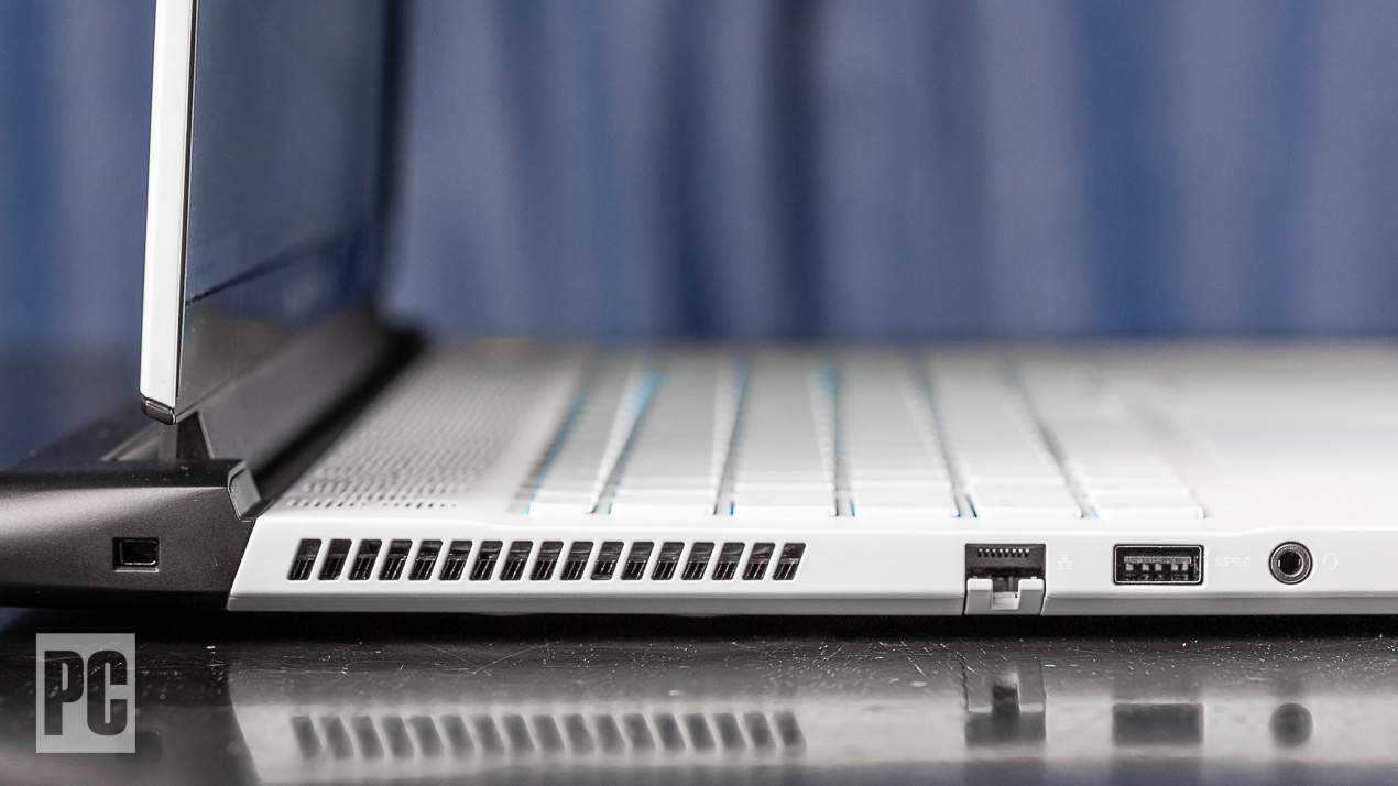 Несмотря на то, что у m17 нет такого же выпуклости в задней части для охлаждения, как у предыдущих версий, он все еще имеет порты с трех сторон. На левом фланце находятся разъем для наушников, порт Ethernet и порт USB 3.0. С правой стороны находится еще одна пара портов USB 3.0. Разъем питания, порт Thunderbolt 3 HDMI, мини-порт DisplayPort и порт графического усилителя Alienware находятся на задней панели.