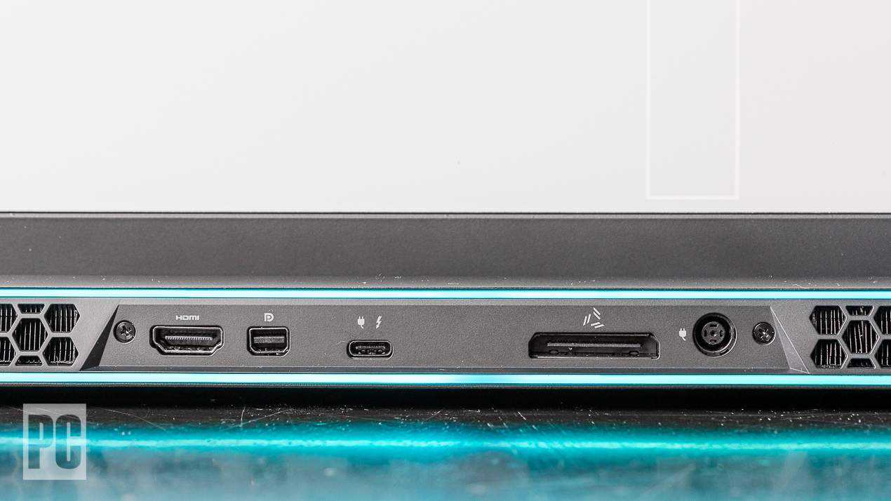 Включенные порты предлагают множество вариантов. На левой стороне ноутбука расположены один порт USB 3.1 Type-A, разъем для наушников и разъем Ethernet, а на правой стороне находятся еще два порта USB-A 3.1 и слот для карт памяти microSD. На задней панели находится все остальное, включая разъем питания, порт HDMI, разъем mini DisplayPort и порт USB-C с Thunderbolt 3. Также имеется собственный порт для внешнего графического усилителя Alienware.