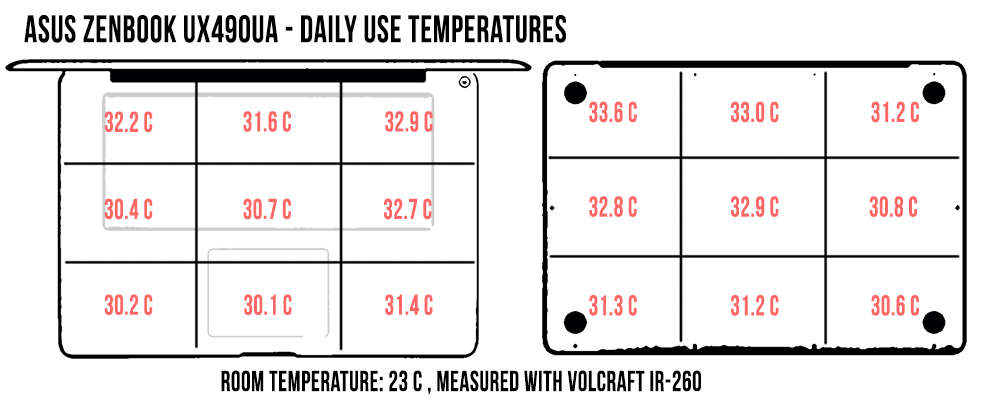 The fan on the UX490 is very thin (3 mm, based on Asus’s press releases) and small though, so while it always spins, it’s not very obvious with daily use, unless you’re in a quiet room. Based on my measurements, daily use noise is at about 38 dB at head level in a environment with an ambient noise of 33 dB, both measured with an iPhone app. High load noise jumped to about 45 dB though, cause when playing games the fan will have to spin much faster, thus it will become noisier.