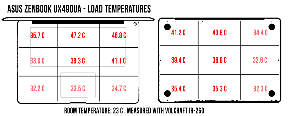 As for external temperatures, the exterior remains cool with daily activities, few parts going close to 35 degrees Celsius, and even high-load temperatures aren’t that high, given the slim shape of this laptop. However, keep in mind the CPU throttled on our sample in games, so expect the final retails to run hotter if they’re not going to throttle as quickly.