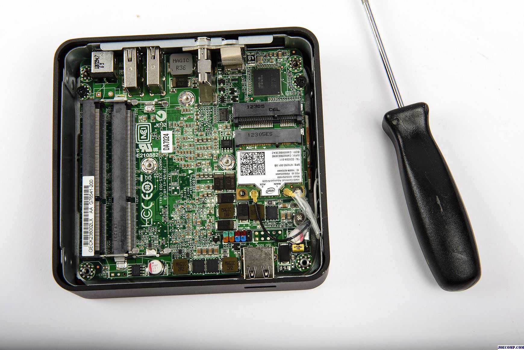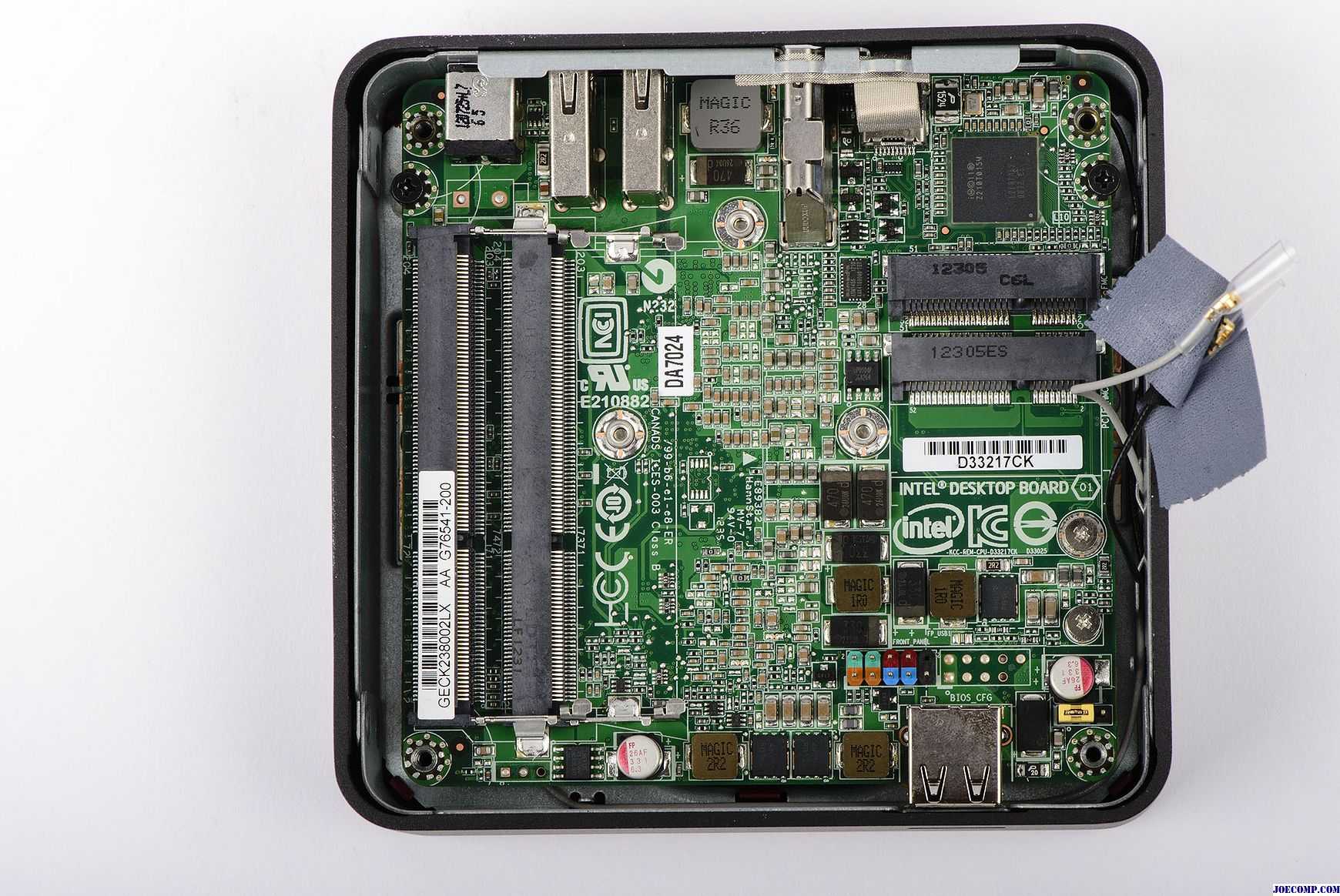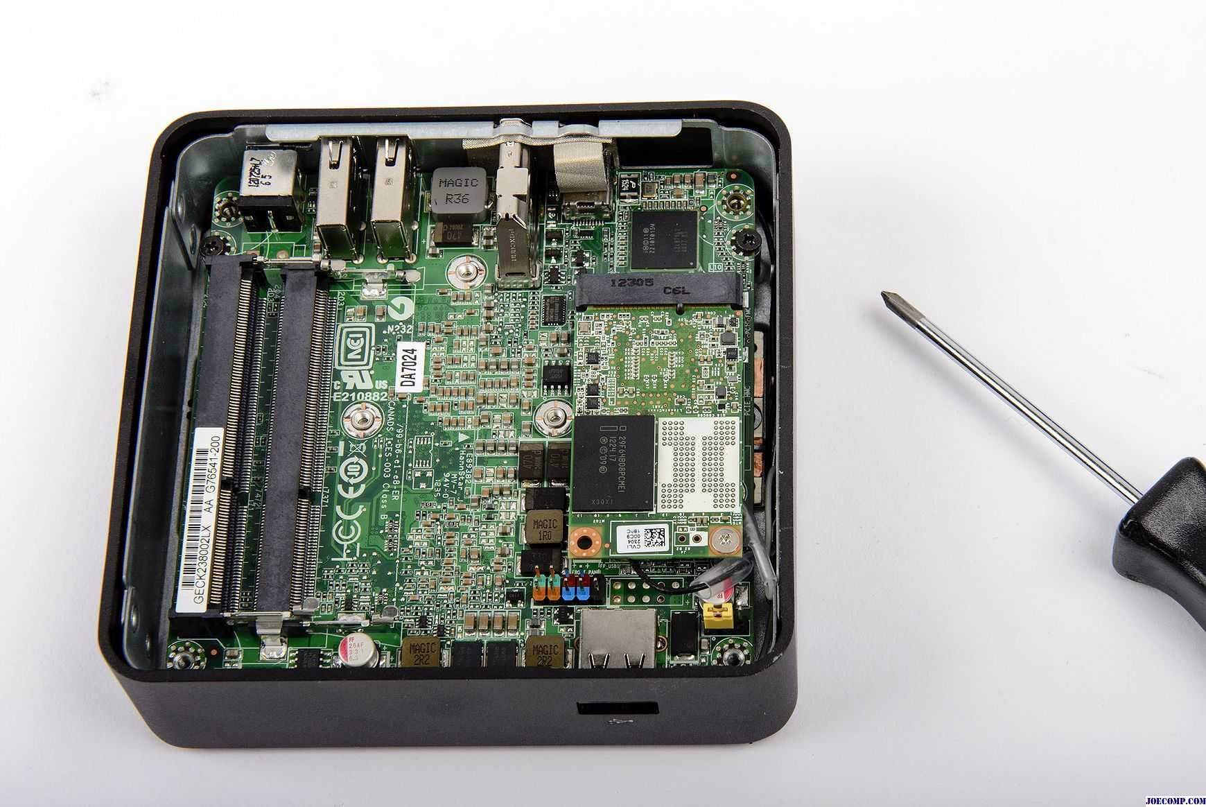 Четыре маленьких винта, встроенных в резиновые ножки, прикрепляют корпус к основанию. После их удаления вы поднимаете основание, что дает вам доступ к внутренним элементам NUC. Все, что вы видите, это все обновляемые пользователем биты SODIMM, слот для мини-PCI Express с поддержкой SSD SSD. Под этим слотом находится полуразрядный слот mini-PCI Express, в котором может быть установлена плата Intel WiFi. Вы найдете маленькие винты рядом с двумя слотами PCI Express. Они удерживают карты mSATA и Wi-Fi, поэтому вы должны удалить их перед установкой этих карт.
