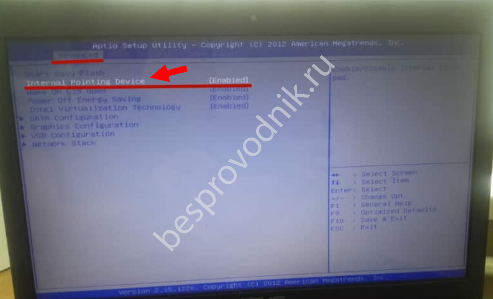 После входа нужно переместиться во вкладку «Advanced». В ней выбрать вкладку «System Properties», а затем «Mouse/Keyboard features» и далее перейти во вкладку «Internal Poiting Device». Там будет пункт «Disable», который нужно выбрать и активировать клавишей Enter. Все, сенсорный экран будет отключен, и теперь можно покинуть Bios, предварительно сохранив все настройки. Сделать это можно при помощи клавиши Esc и следованию подсказкам на экране ноутбука.