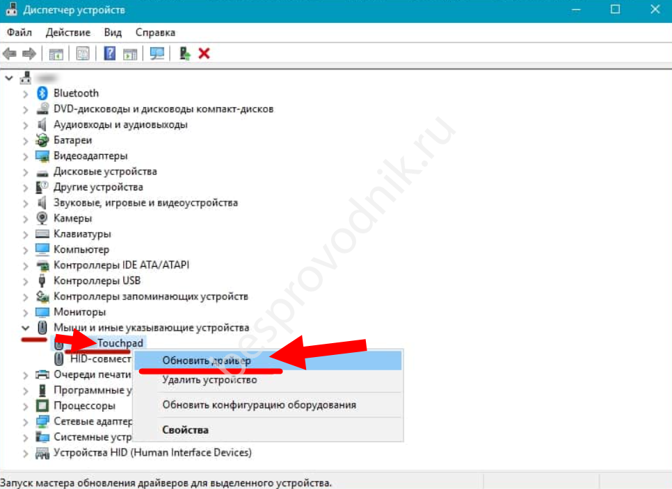 Итак, теперь выделите строку с тачпадом и на панели инструментов нажмите иконку обновления драйвера.