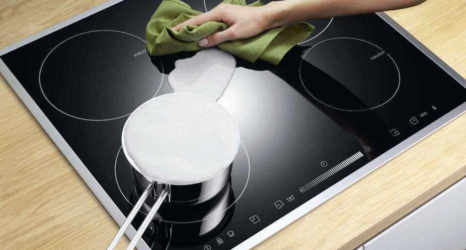 - Особого внимания требует уход за плитами со стеклянной варочной поверхностью, которые можно легко поцарапать жёсткими губками и чистящими порошками. Поэтому быстро удалить загрязнение помогут только максимально мягкие щётки и неабразивные составы.