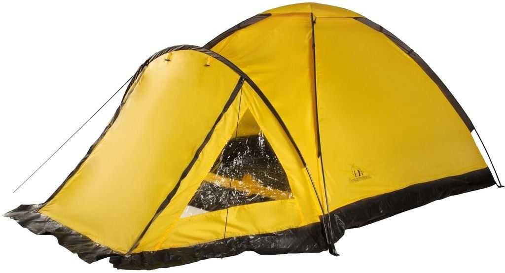 Небольшая экстремальная палатка на 2 места полусферической формы. Комната одна, но входов и тамбуров по два. Имеется 2 вентиляционных окна. Устанавливается просто, для сильного ветра предусмотрены штормовые оттяжки. Внешние габариты– 290×220×120 см, внутренняя палатка меньше – 150×210 см. Вес всего –3,5 кг. Стоит 10500–10600 рублей.