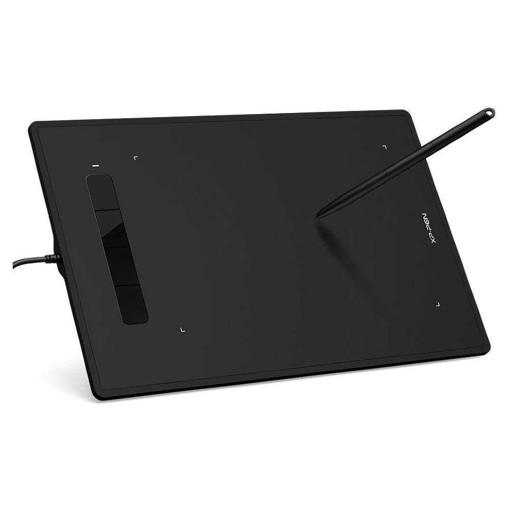 Планшет поставляется с автономным пером, работающим без батареек. Ручка позволяет создавать четкие, тонкие линии, работает без задержек и прерываний. Поддерживает 4096 степеней нажатия, считывается на минимальной высоте в 7 мм. Для удобства на стилусе расположены 2 настраиваемые кнопки, еще 4 – на корпусе планшета. Размер рабочей поверхности соответствует формату А5.