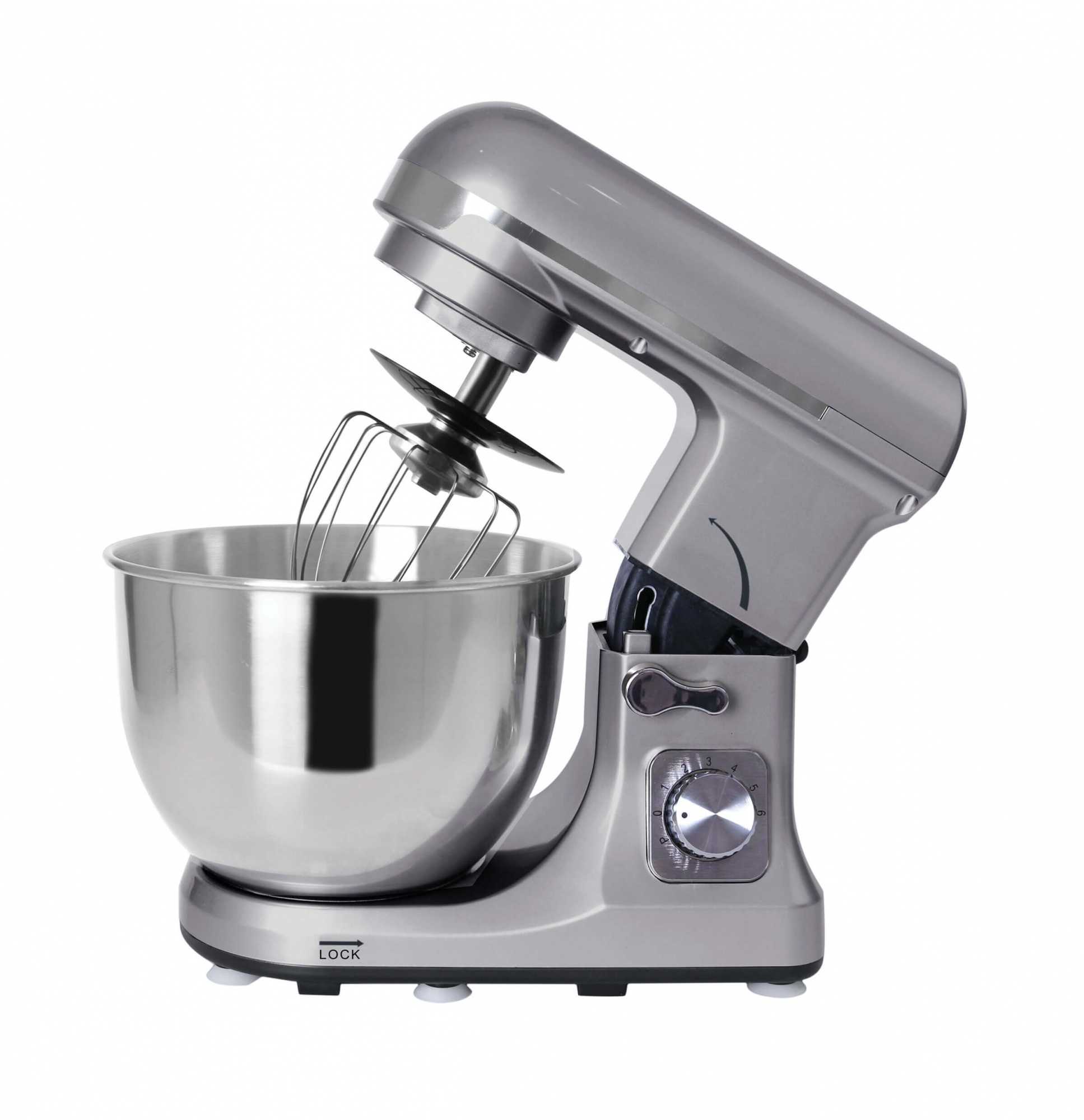 Недорогая модель с металлической емкостью 5 л поставляется вместе с венчиком и крюком для теста. Планетарный агрегат успешно справляется с замешиванием жидких и плотных продуктов, производительность составляет 800 Вт.