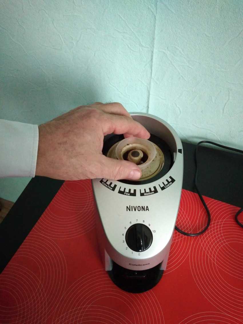 - Когда вы перемололи зёрна, нужно очистить камеру от остатков. Для этого используйте сухую салфетку, затем откройте кофемолку и дайте ей немного проветриться.