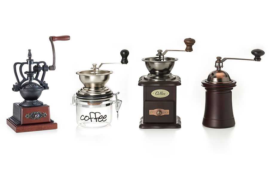 На рынке представлены кофемолки двух типов — ручные и электрические. Каждая из них имеет камеру для зерен, механизм измельчения и контейнер для молотого кофе (он может быть интегрирован с камерой для зерен или отдельно).