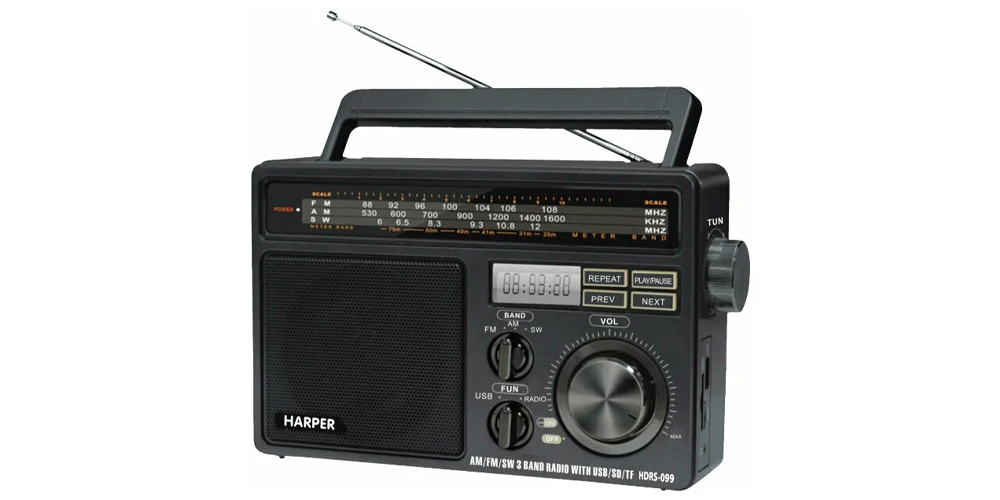 Переносной приёмник с интересным дизайном «под старину». Аналоговый тюнер уверенно работает в диапазоне частот FM, ДВ, СВ. HARPER HDRS-033 имеет аналоговый поиск частот. Один динамик с мощностью звука 3 Вт позволяет наслаждаться музыкой, слушать радиопередачи. Можно воспроизводить записи с SD, USB-носителей. Работа от съёмных элементов питания и от сети. Цена — 1690 рублей.