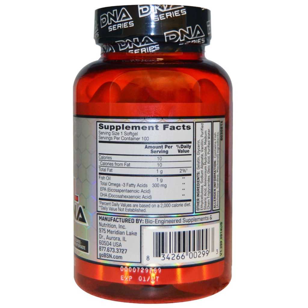 Полное название расшифровывается как Bio-Engineered Supplements and Nutrition, что означает производство биоинженерных добавок и питания. В ярко-красной банке содержатся капсулы, относящиеся к новой серии BSN DNA. Привкус рыбы отсутствует за счет кишечнорастворимой оболочки, ценный ресурс поступает в продуманном количестве, покрывает дневную потребность.