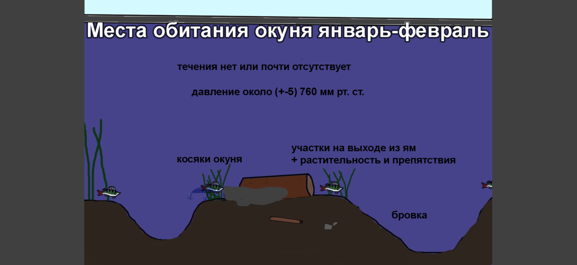 - Январь и февраль. В глухозимье окуни всех размеров уходят в толщу воды, на самую глубину. В этот период нужны прикормки. В ямах искать окуня не стоит, он находится возле них.