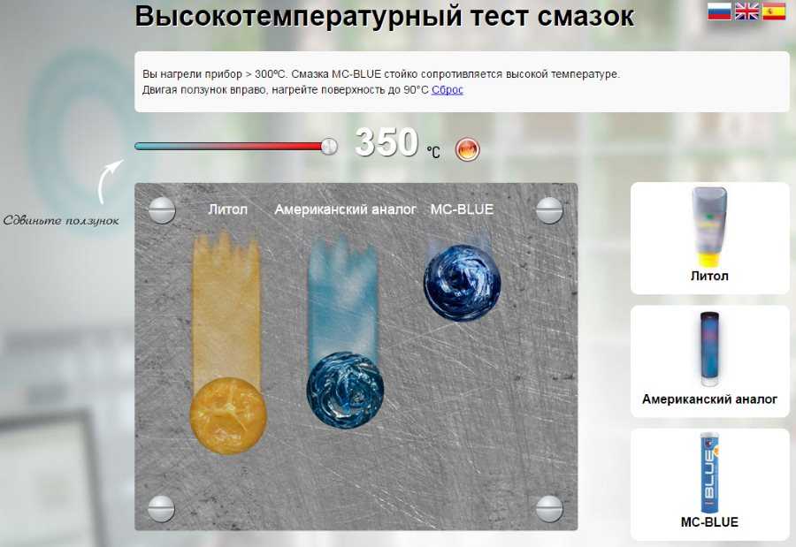 Для того чтобы показать, насколько существенно МС 1510 BLUE отличается от аналогичных продуктов, на сайте производителя даже опубликовали специальную страничку, имитирующую работу смазок при нагреве. Ниже мы публикуем скриншот, на котором изображено поведение разных продуктов при максимальной температуре 350°С. Видно, что МС 1510 BLUE фактически стоит на месте, чего не скажешь об иных вариантах.