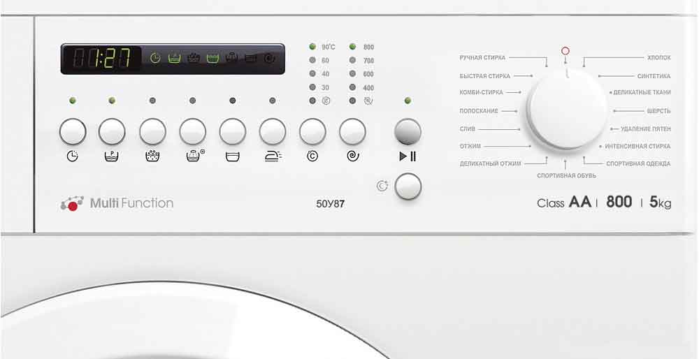 Представлено 15 автоматизированных программ, включая быструю, а для управления функционалом используется поворотная ручка и классические механические клавиши. Уровень шума при отжиме доходит до 74 Дб. Есть базовые защитные механизмы и небольшой экранчик, на который выводится актуальная информация о времени стирки и выбранных параметрах. Поддерживается блокировка панели управления от детей.