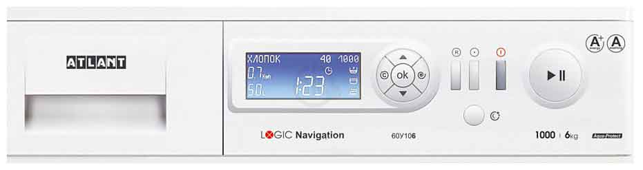 Машинки Аtlant представлены в узком и стандартном варианте с полным набором необходимых функций. Управление осуществляется поворотом ручки в нужное положение и нажатием кнопки «Старт/Пауза». В них предусмотрено несколько вариантов стирки для каждого типа тканей, например, для шерсти – 2, хлопка – 4. Дополнительная функция только одна – Aquaprotect.