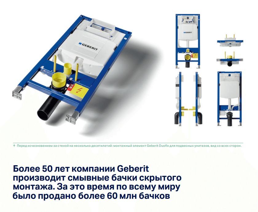 Более 50 лет компании Geberit производит смывные бачки скрытого монтажа. За это время по всему миру было продано более 60 млн бачков