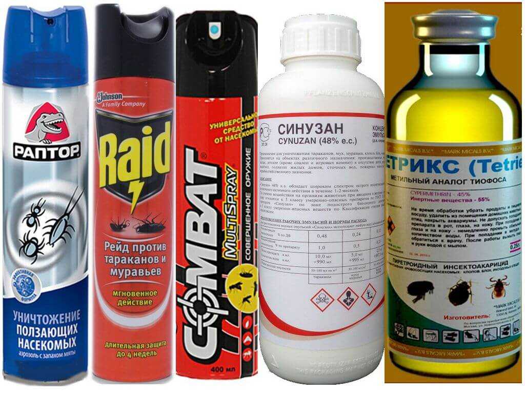 - Синузан — инсектицид, используемый профессионалами дезинсекции, имеет высокую эффективность, но сильно токсичный, поэтому требует применение качественных защитных средств при обработке химией квартиры;