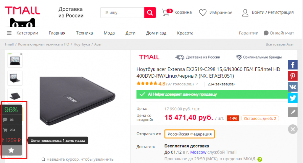Рис. 9. Браузерное расширение AliHelper.