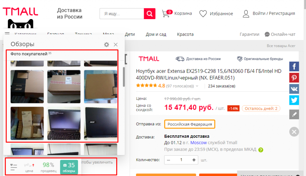 Расширение позволяет узнать, сколько покупателей выбрали этот товар, и какой процент положительных отзывов у продавца.