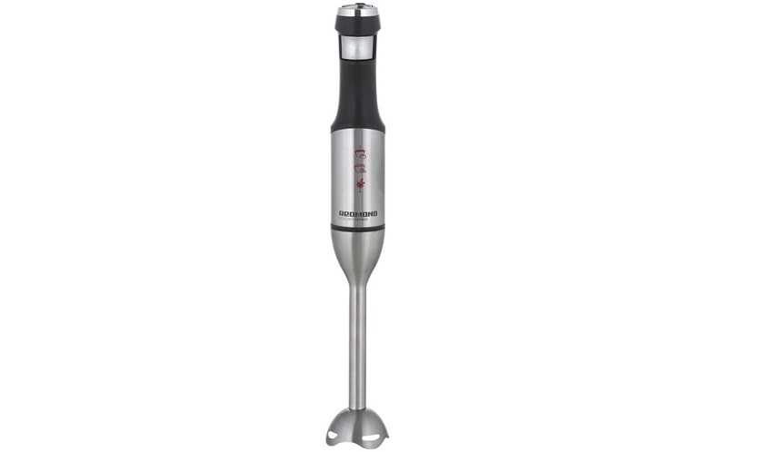 Это одна из самых популярных моделей фирмы Redmond. Этот погружной блендер имеет оптимальную мощность (1200 Вт), пять скоростей работы и турборежим. В комплектации идет измельчитель, венчик для взбивания и мерный стакан. Модель достаточно простая, не имеет каких-то особенных опций, но, по отзывам пользователей, очень удобная и надежная. Производитель предусмотрел защиту от перегрева, поэтому блендер можно использовать в интенсивном режиме, не переживая, что он сгорит. Этой же модели присуща отличительная черта всех блендеров Редмонд – привлекательный, стильный дизайн.