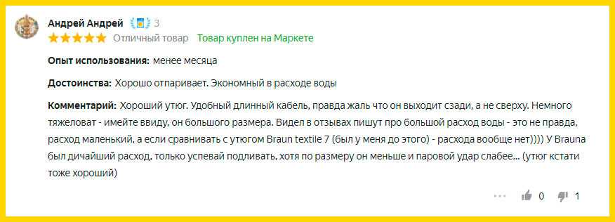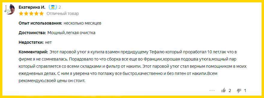 К преимуществам модели относится наличие функции автоотключения, система очистки от накипи Quick Calc Release с индикацией заполненности контейнера. Покупатели считают, что благодаря продуманному дизайну смотрится этот не маленький утюг весом 1,7 кг изящно и стильно.