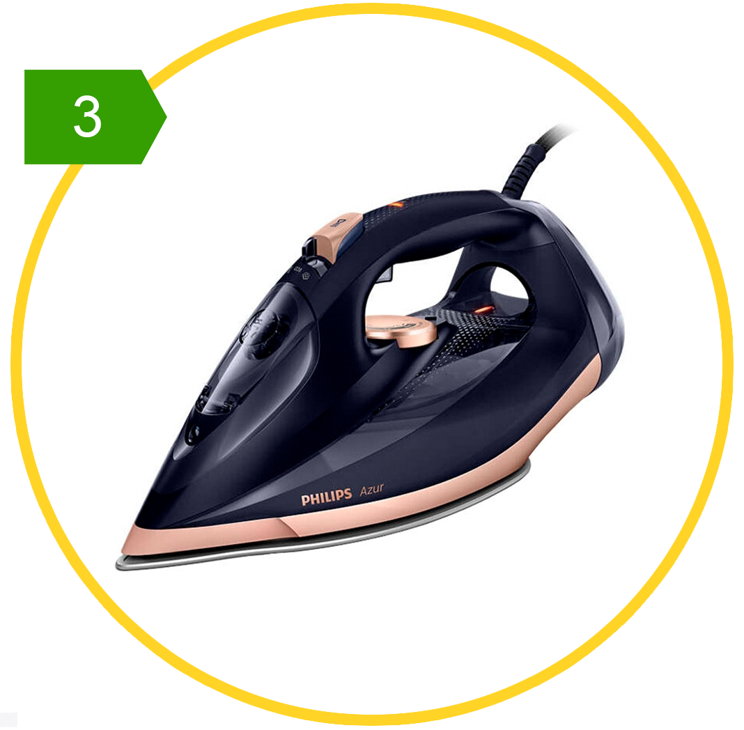 На втором месте модель с интеллектуальными функциями Philips GC5034/20 Azur Elite. Этим утюгом можно гладить вещи из самых разных тканей, без использования ручных настроек температуры. Риск испортить вещь здесь просто исключен.