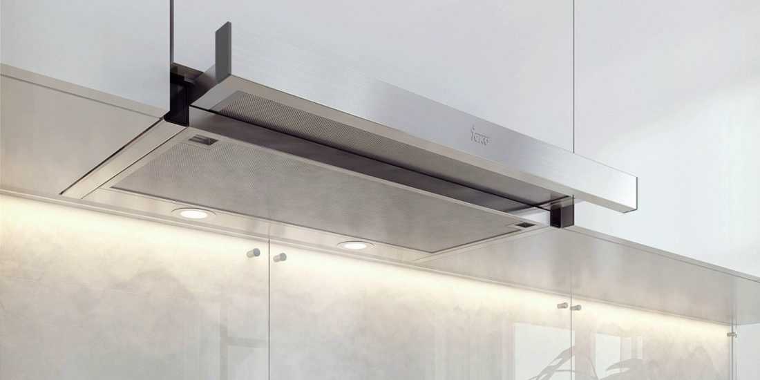 Встраивание в потолок решит проблему сохранения места в шкафах. Если разместить вытяжку внутри натяжного или навесного каркаса, она вовсе сможет остаться незамеченной — снаружи будет видна лишь декоративная решетка.