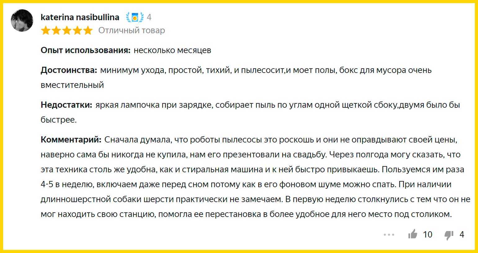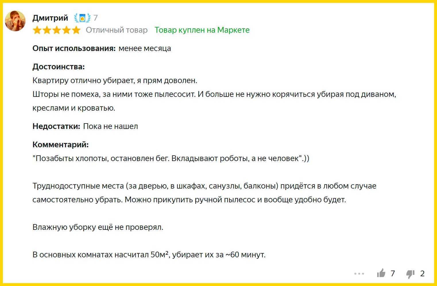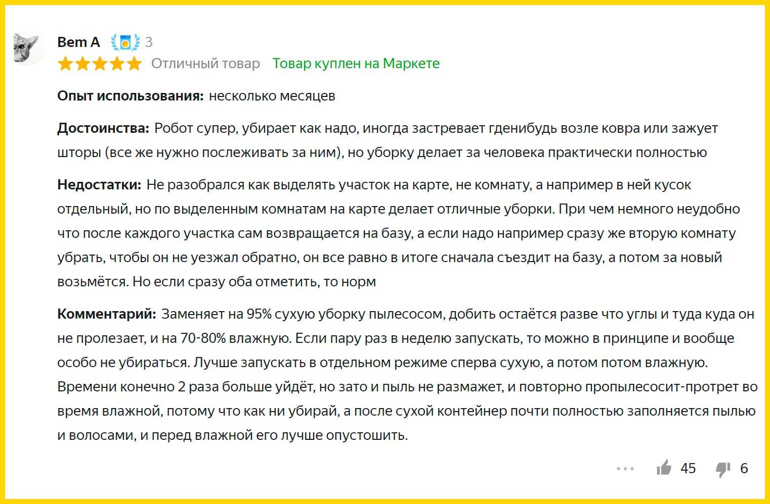 Отзывы о модели есть разные – и хорошие, и не очень. В целом, покупатели довольны приобретением, отмечают, что убирает пылесос неплохо, очищает воздух, более тщательно собирает пыль благодаря встроенной емкости для воды. Робот ни во что не врезается, аккуратно объезжает препятствия. Недовольство вызывает шумная работа, особенно если ночью устройство застревает – писк может перебудить всех домочадцев. К недостаткам относят и непродолжительную автономную работу в режиме повышенной мощности.